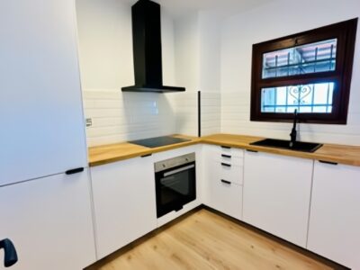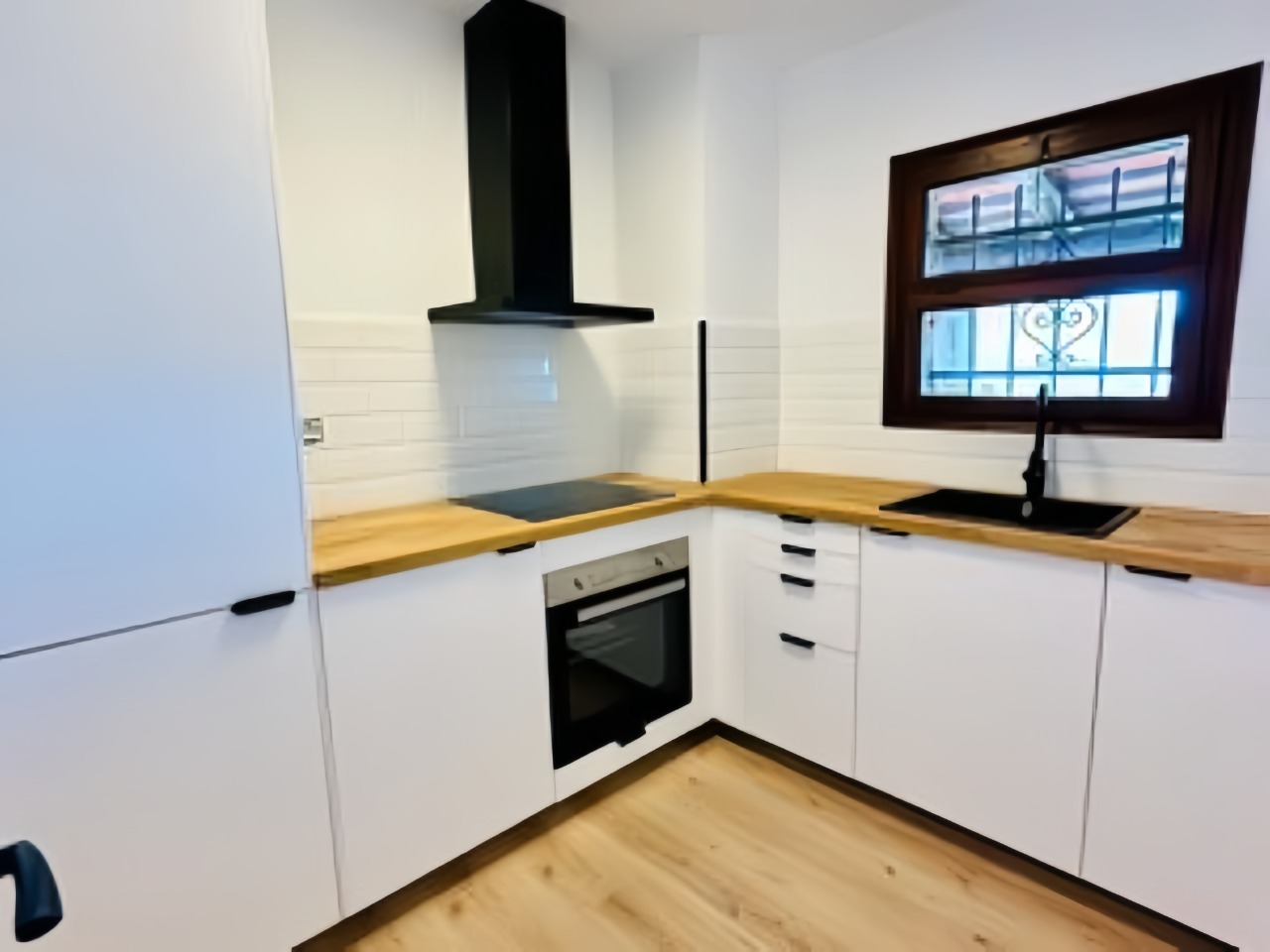 El techo del mismo, acondicionado con lana de roca y pladur, respetando una biga grande de madera natural que le da un toque muy bonito y acogedor.Seguidamente, entramos en la cocina, funcional y totalmente reformada.