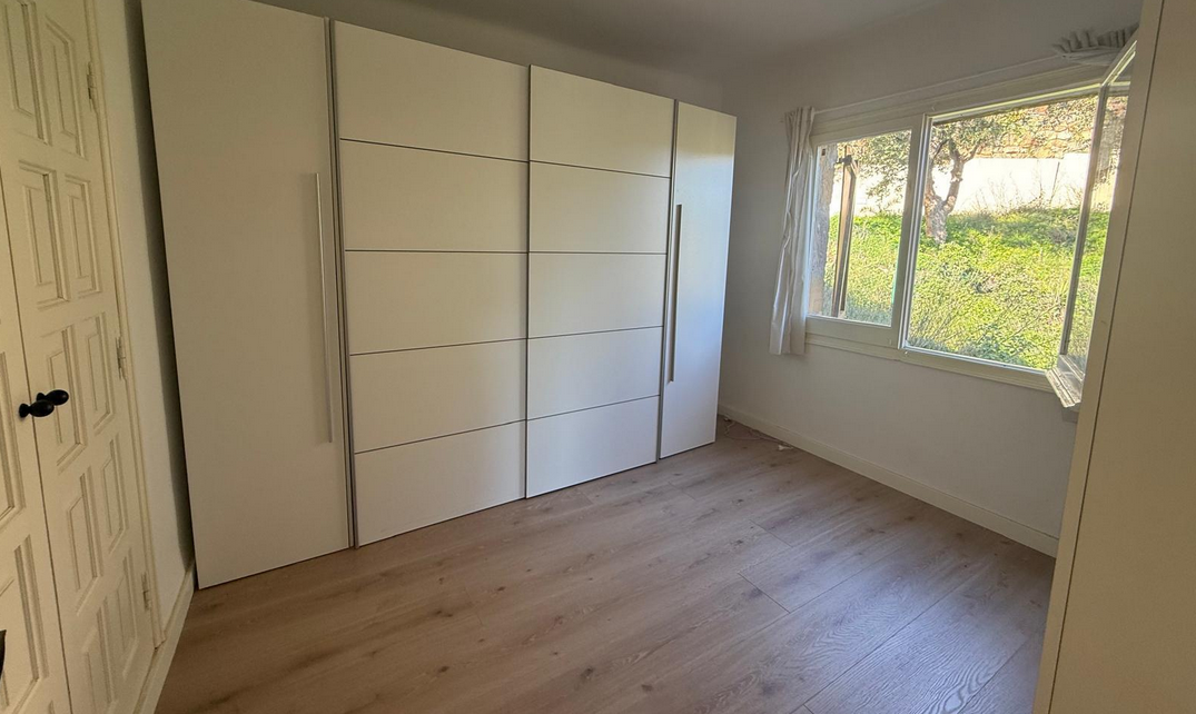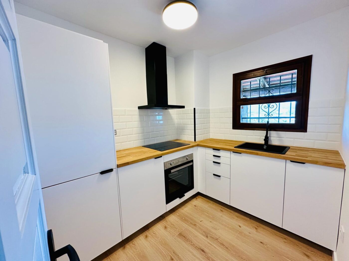 La casa cuenta con cocina, un baño completo y dos habitaciones bien distribuidas. La habitación principal destaca por su armario empotrado, ofreciendo un práctico espacio de almacenamiento.